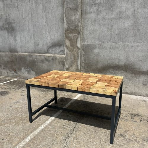 Esta mesa única, hecha completamente a medida, combina diseño artesanal y materiales nobles para crear una pieza con fuerte personalidad. Su sobre de madera maciza de pino, cuidadosamente seleccionada, está trabajado siguiendo un patrón personalizado tipo puzzle, relleno con resina epoxi transparente que genera un efecto visual sorprendente y artístico.