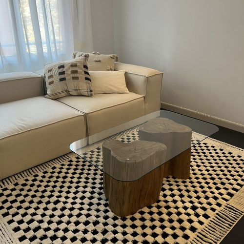 Esta mesita destaca por su diseño excepcional y su cuidada selección de materiales. Está elaborada con dos patas únicas de tronco de teca blanca, escogidas minuciosamente por su resistencia, textura y belleza natural, lo que convierte cada pieza en algo irrepetible.