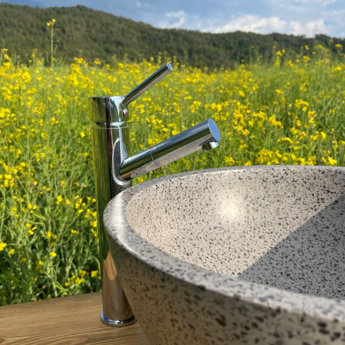 La combinación de materiales —madera, cerámica y hierro— y la armonía entre líneas rectas y formas curvas hacen de este lavabo una fusión perfecta entre estilo contemporáneo y artesanía. La pica esférica de cerámica añade un toque escultórico que convierte esta pieza en el centro de todas las miradas.