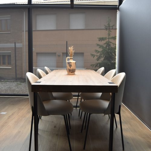 La mesa de comedor Teguese destaca por su elegancia natural y robustez. Fabricada con madera de pino de alta calidad, presenta una superficie cálida y texturizada que resalta la belleza de los materiales nobles. Sus patas metálicas integradas, en pasamano de 100×15 lacadas en negro mate, aportan un contraste moderno y sofisticado, ideal para ambientes de estilo industrial o contemporáneo.