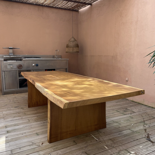 La mesa de comedor Iroko es una pieza imponente que combina elegancia natural y funcionalidad en un diseño de gran formato. Fabricada íntegramente con madera tropical de iroko de 6 cm de grosor, tanto en la superficie como en las patas, destaca por sus bordes naturales que le otorgan un carácter orgánico y único.