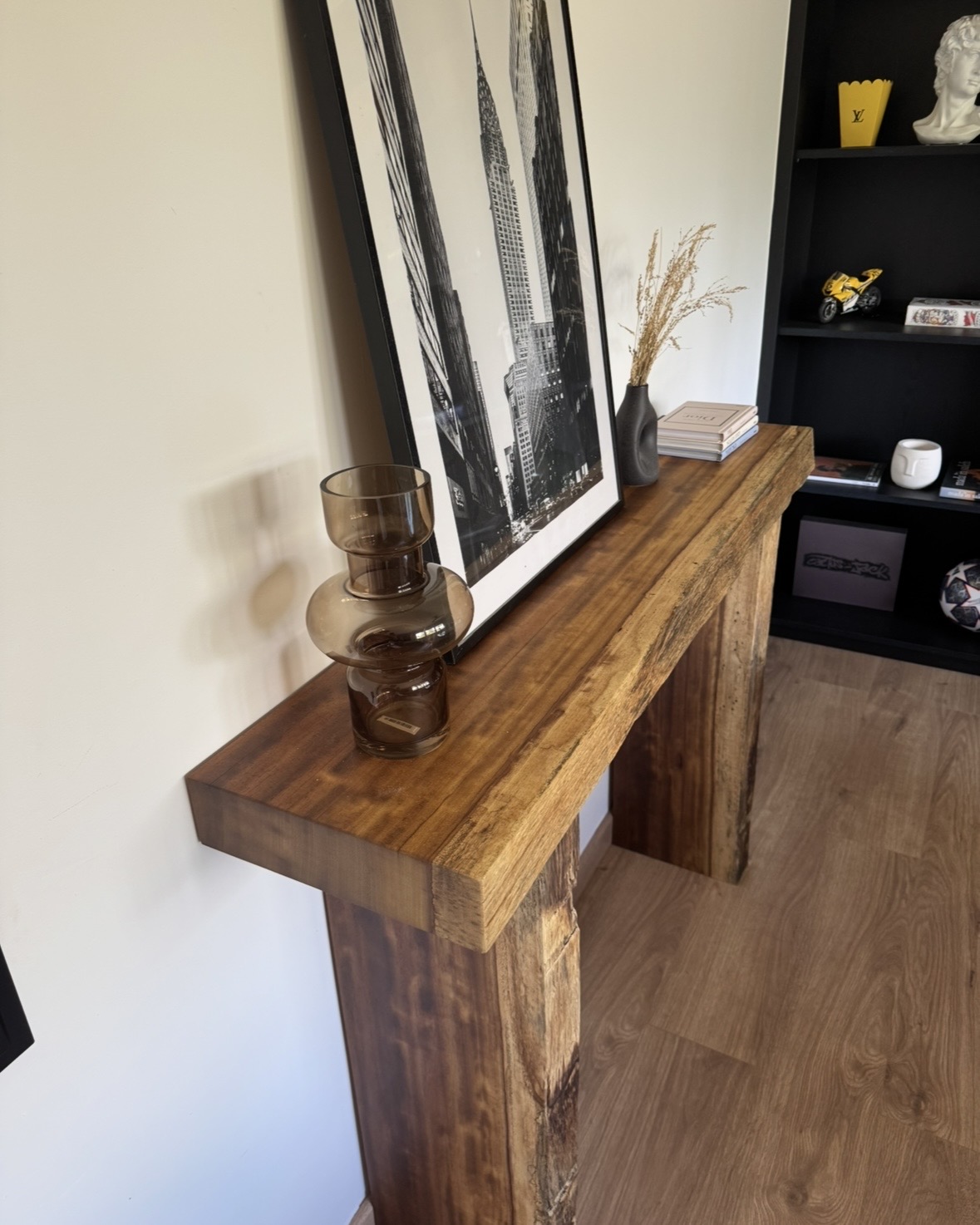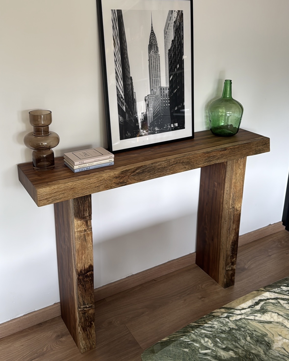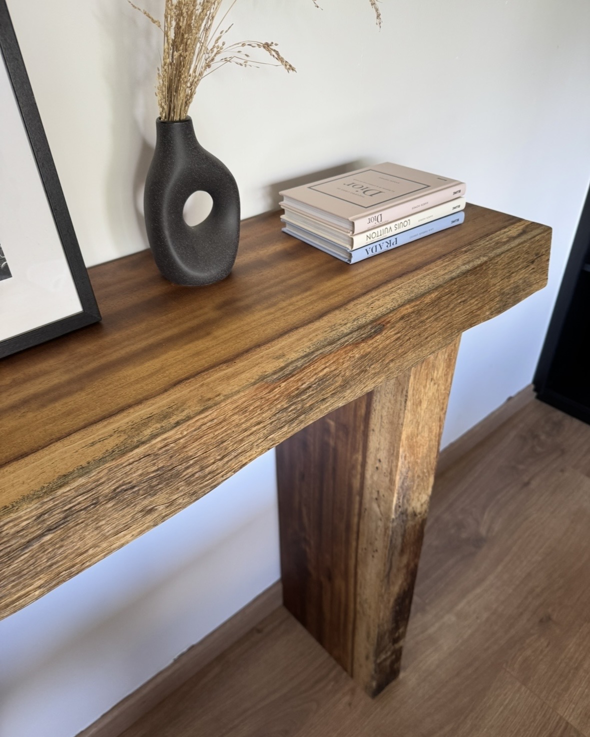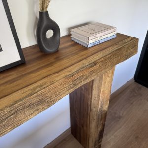 La mesa de recibidor Iroko es una pieza elegante y atemporal fabricada en madera maciza de iroco, una especie tropical de alta densidad reconocida por su gran durabilidad, estabilidad y resistencia natural.