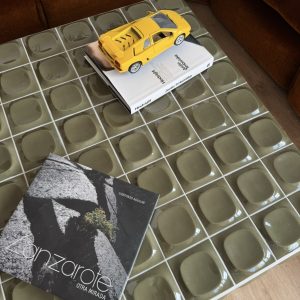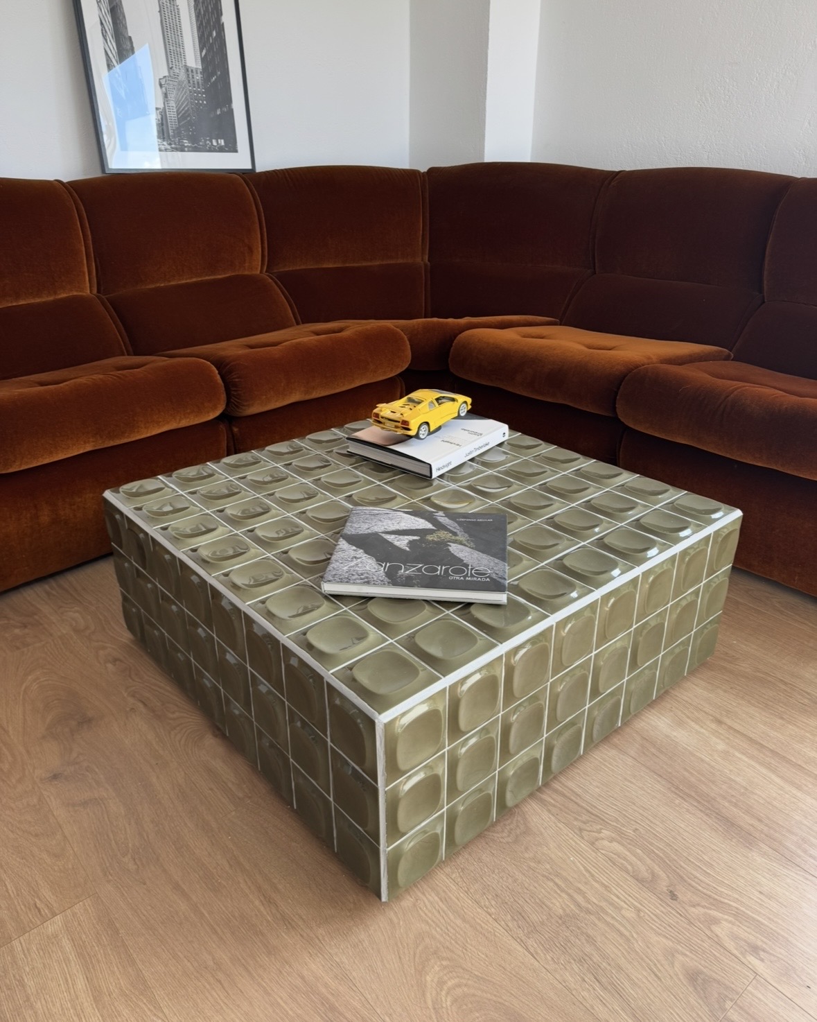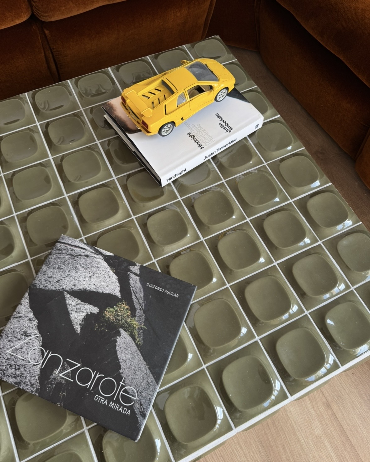 La mesa de centro Tile Table es una pieza de diseño con un marcado carácter decorativo, inspirada en el estilo pop y contemporáneo. Está elaborada con azulejos en tono verde oliva, creando una superficie visualmente atractiva que aporta personalidad y un toque artístico a cualquier espacio.
